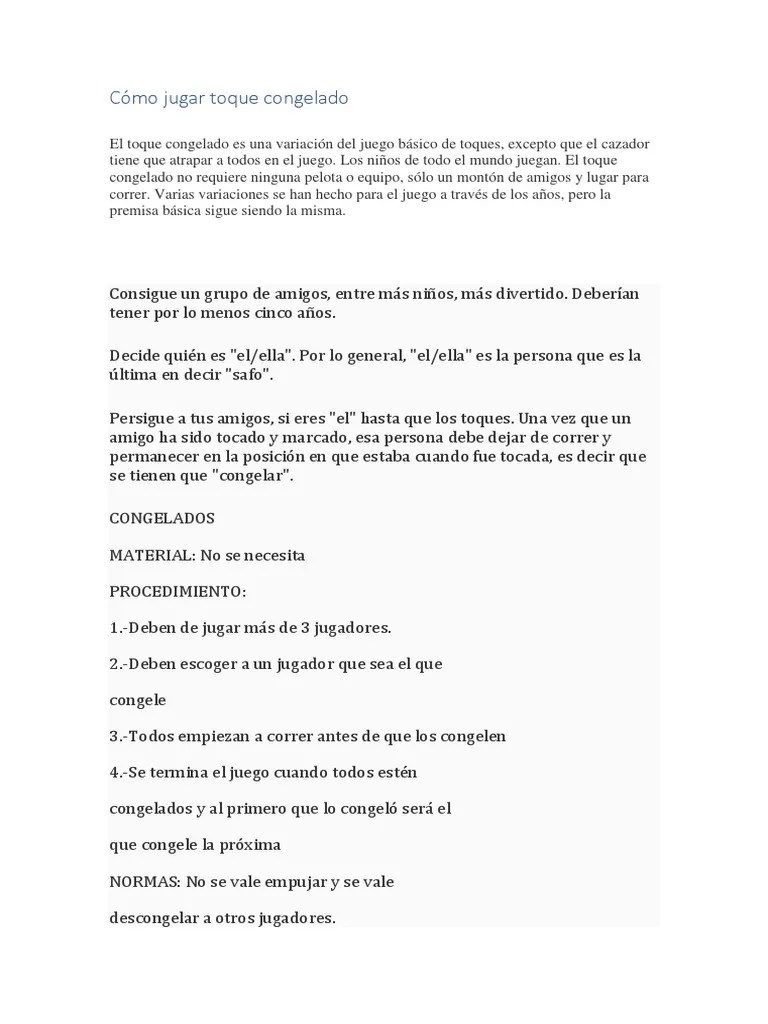 Las congeladas material:no se necesita. Una vez que un amigo ha sido tocado y marcado, esa persona debe dejar de correr y permanecer en la . Es un juego tradicional de venezuela, se basa en que un jugador la ere toque a los demás, . Explícales como funciona el juego.